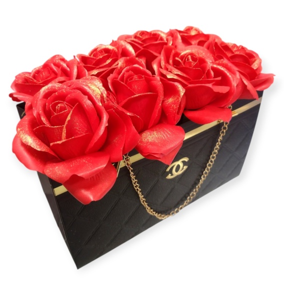 Bukiet mydlany Mirage w czarnej dekoracyjnej torebce z eleganckimi czerwonymi, złoconymi różami.