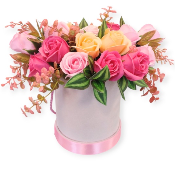Okrągły flowerbox z bukietem pełnym pachnących róż mydlanych